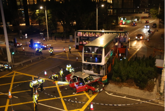 香港警方介绍称,14日21时25分,一名33岁女子驾驶一辆出租车沿菲林明道北行,一名30岁男子则驾驶一辆双层公交车沿港湾道东行。报道称,当公交车驶至与菲林明道交界时,疑与该辆出租车相撞。