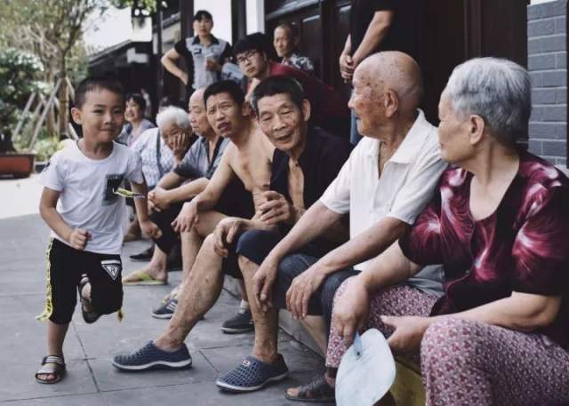 2017年7月13日,重庆奉节白帝城。一名男孩从坐在路沿上歇息的一排老人面前跑过。海军准将 摄