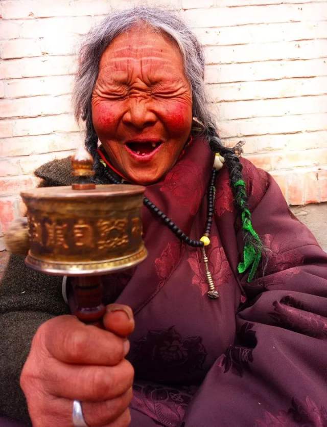 2017年2月9日,甘肃甘南藏族自治州。一个藏族老太太笑容满面,洋溢着幸福。秋天的枫叶 摄