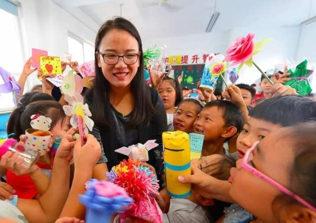 2017年9月8日,河北邯郸。2017年教师节来临之际,渚河路小学学生们为老师献上自制的工艺品,祝福老师节日快乐。代国祥 摄