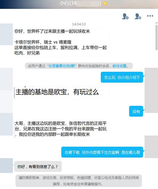 △记者加入上述的赛事交流群后,一位名为“小行”的群成员很是热情,不断发消息催促记者注册“欧宝体育”平台。